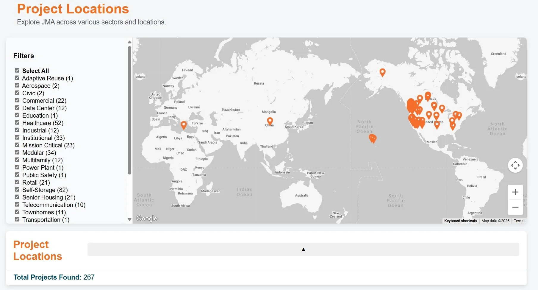 Each pin represents a story - a built environment shaped by JMA’s commitment to responsive, thoughtful design. Explore our international footprint.